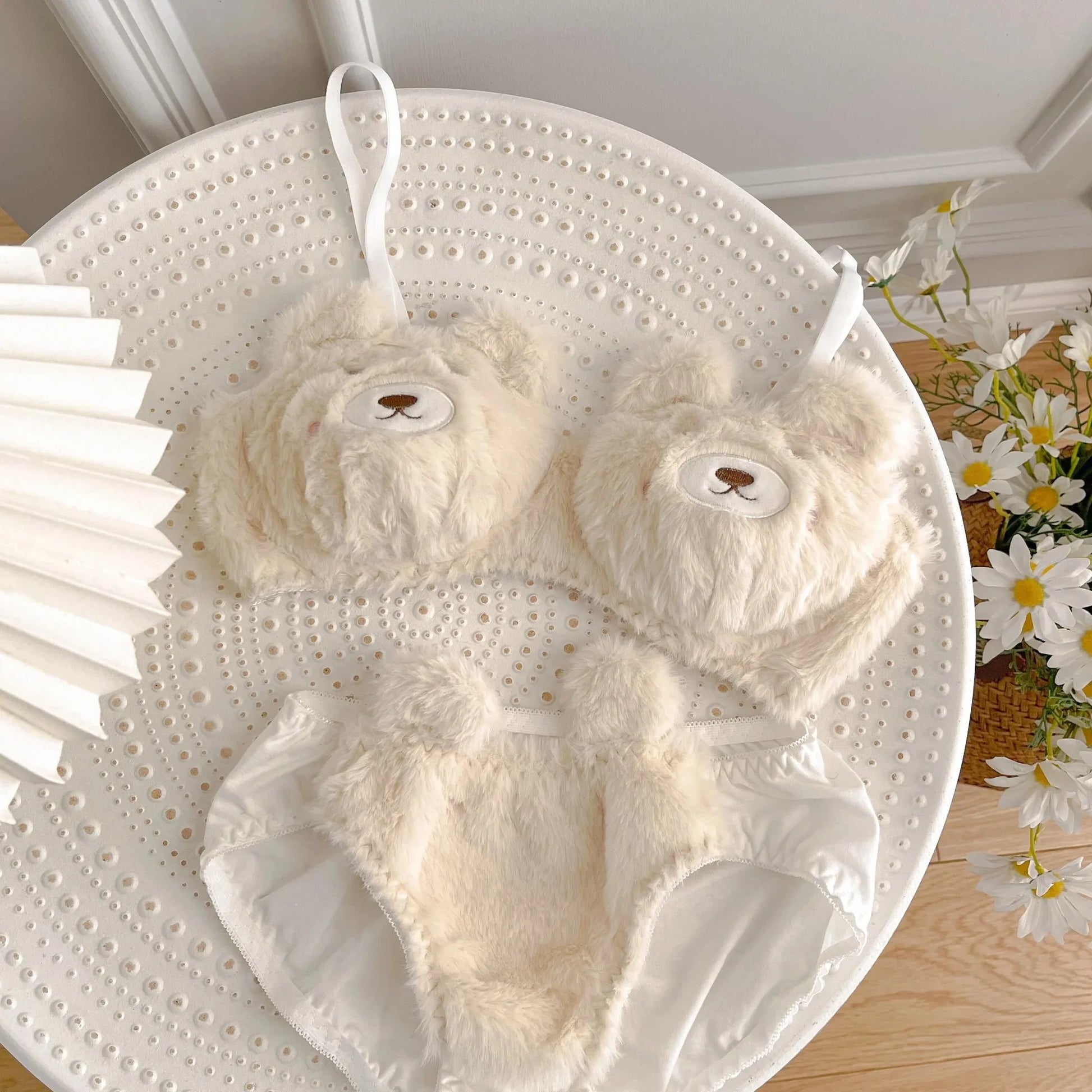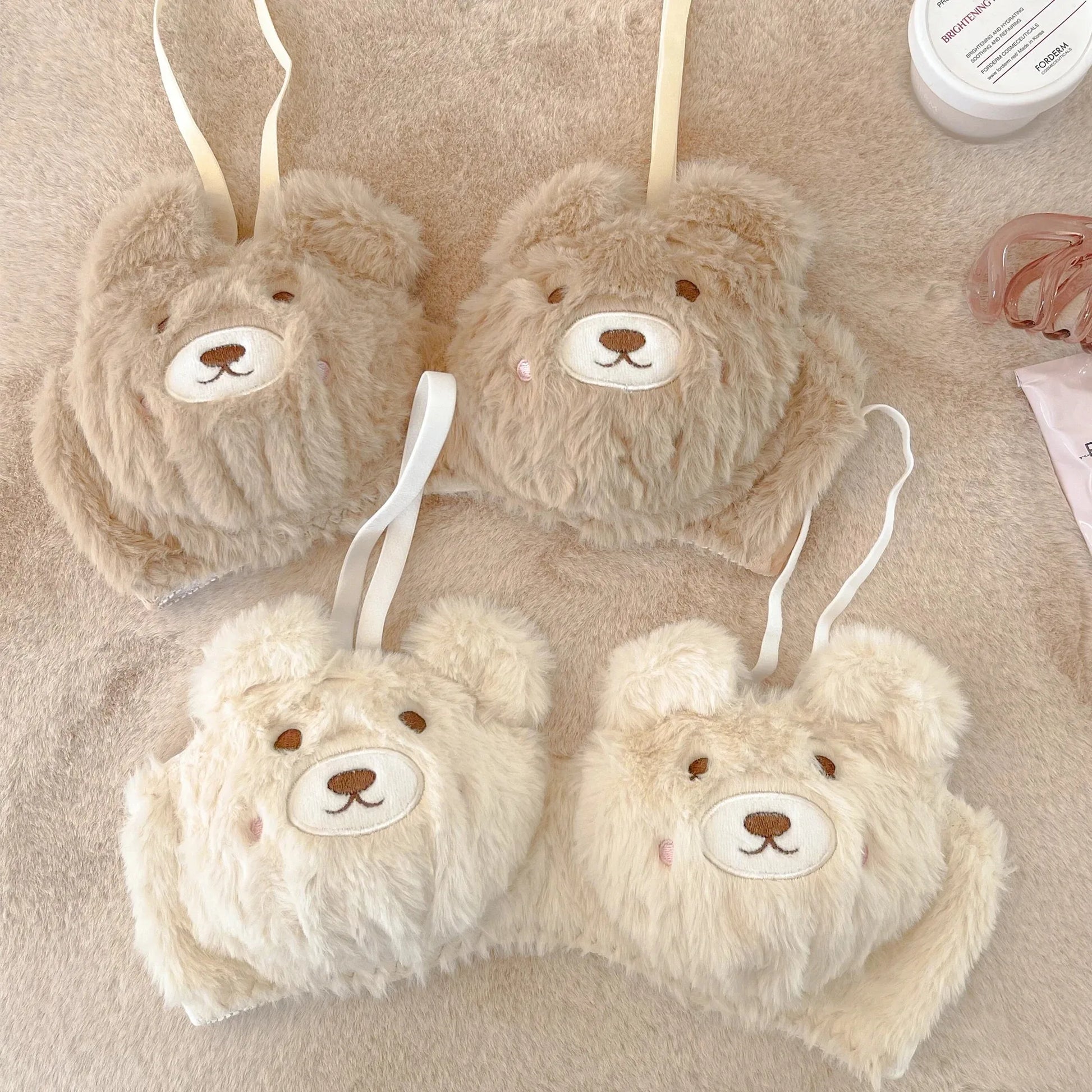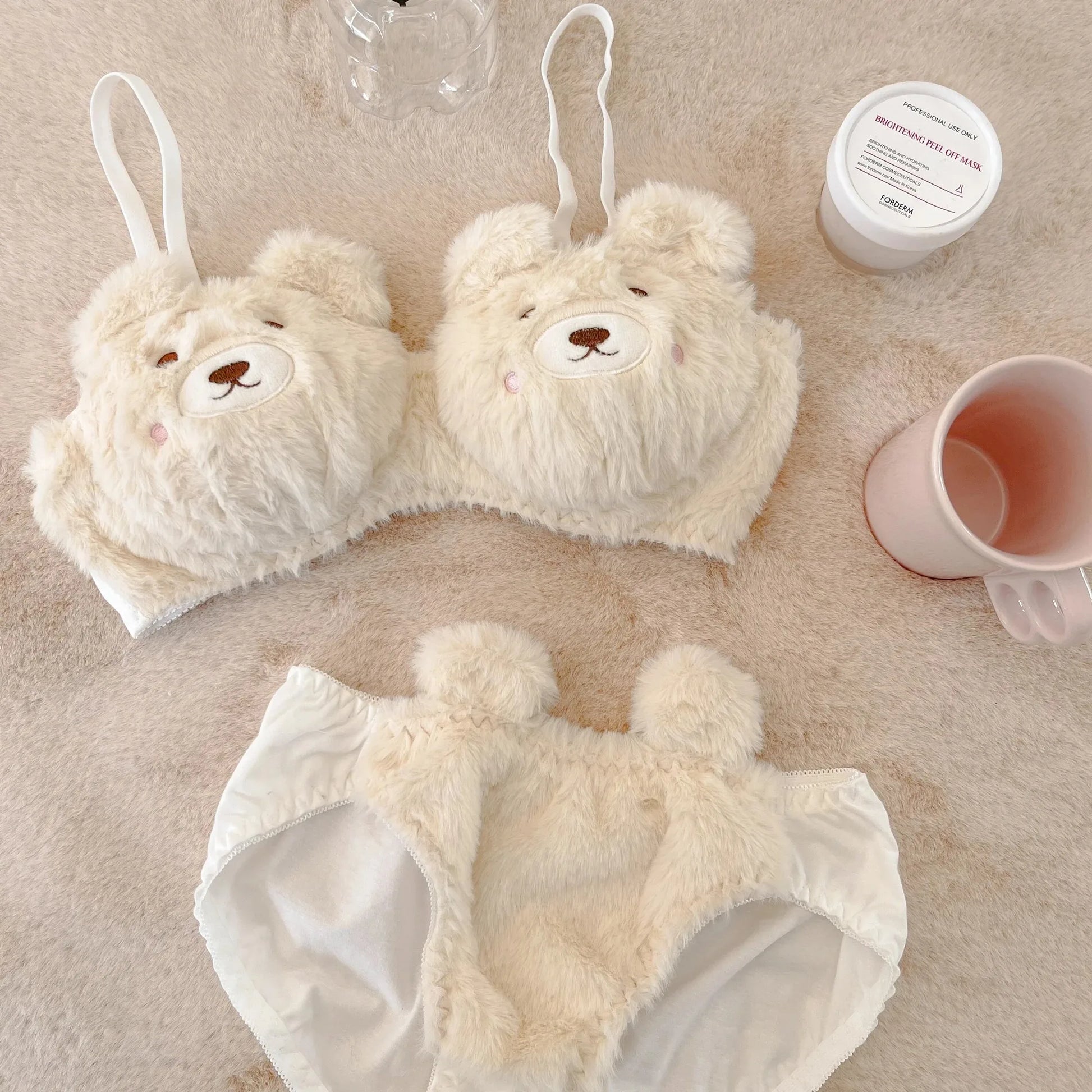 Underwear girl winter cute cartoon plush bear bra set without steel ring student small chest gather lingerie with udnerpants suit